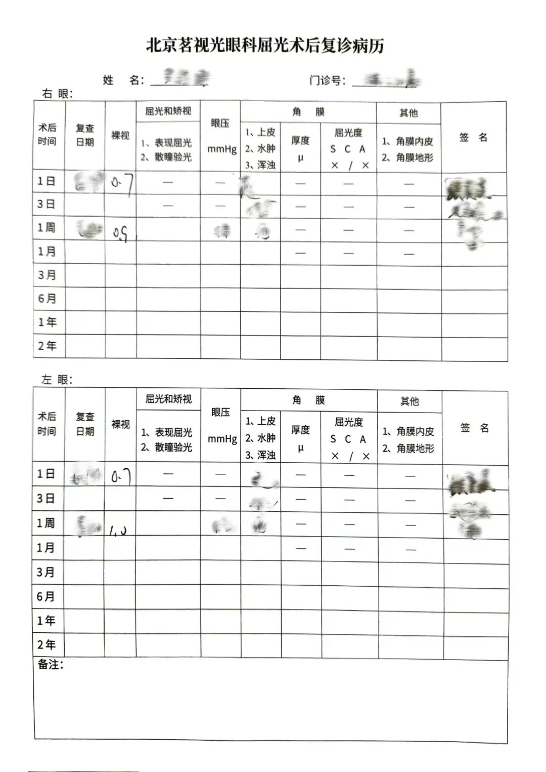 患者术后一日右眼视力0.7,左眼视力0.7,术后一周视力右眼0.9,左眼1.0,通过征兵体检完全没有问题。