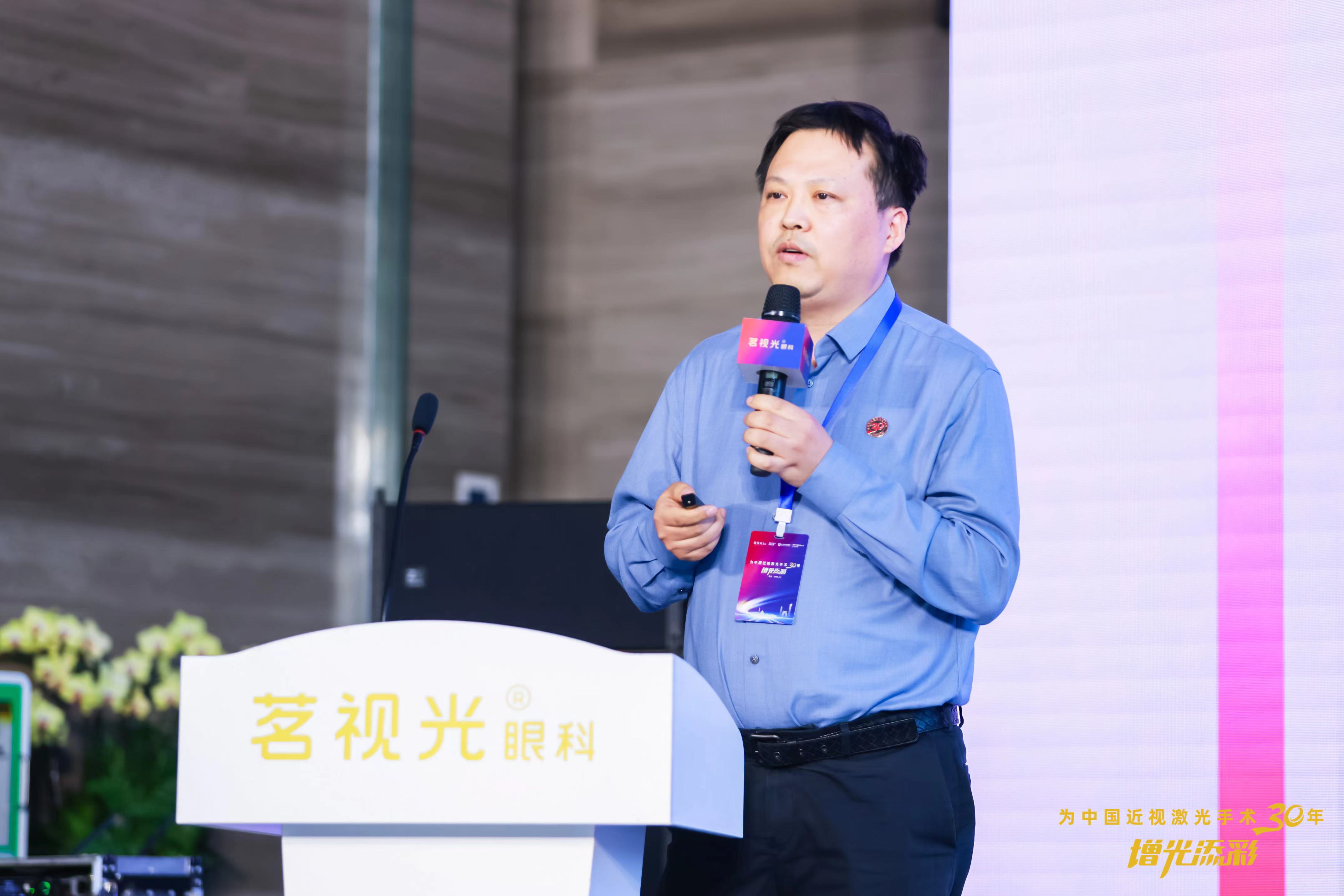 原北京同仁医院眼科视光中心主任、现北京茗视光眼科总院长周跃华教授上台致辞,感谢各位嘉宾的莅临并表示热烈的欢迎。他回顾了近视手术30年的发展历程及中国医生在此期间取得的成就。对近视手术与眼科同行表达了崇高的敬意以及共创美好未来的期盼。